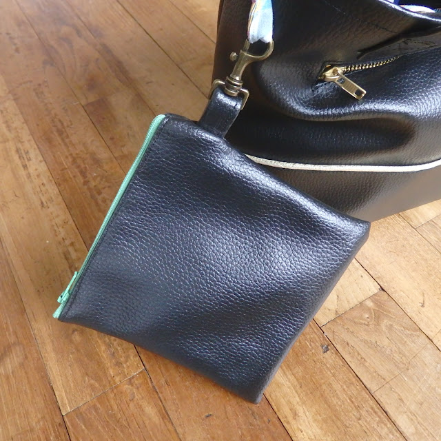 Entourée donc de quelques couturières amateures comme moi, j'ai quasiment bouclé dans la journée ce joli sac en simili, avec poche passepoilée, doublée et passepoilée avec du kibrille, parce que le kibrille, c'est la vie, et pochette assortie.