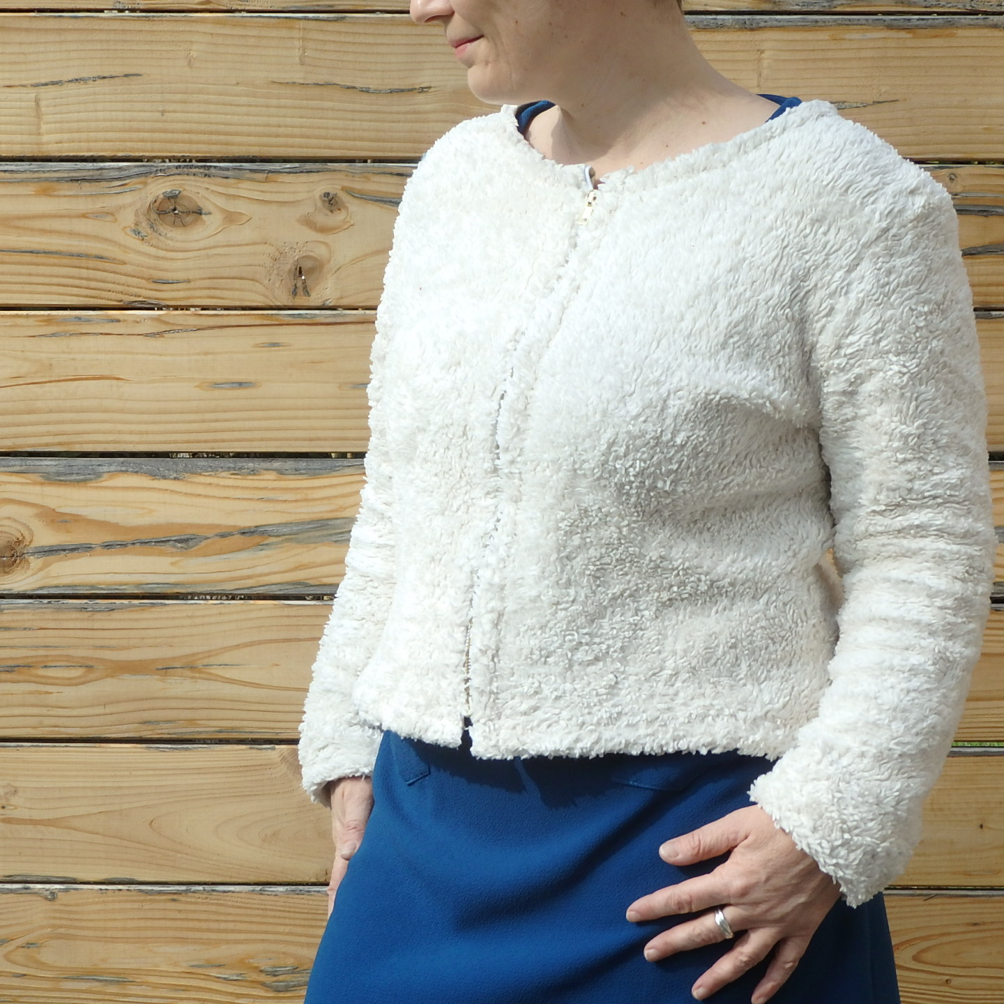 J'avais très envie d'un cardigan bien chaud, et le jersey "fausse fourrure" de Fil Etik (qui propose des tissus bios) tout en coton me faisait de l’œil depuis un moment. Et soudain, le déclic : un petit cardigan dans ce tissu si doux et si moelleux.